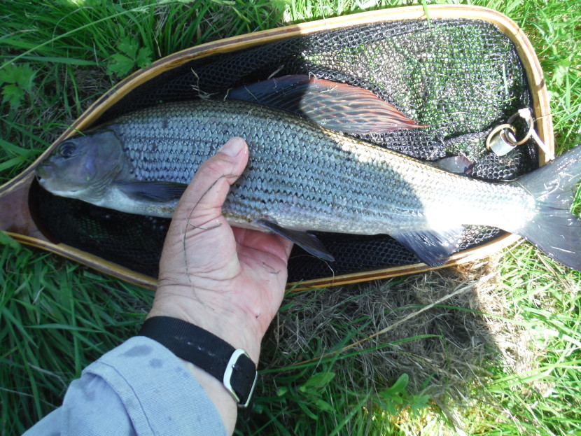 Lugg grayling Otherwise, main river Wye, Lugg, Arrow, Ithon and Irfon grayling are assumed to be natives and all these, apart from the famous coral coloured fins and gold streaks on the belly, tend to have flanks in various tinges of gun metal grey, and sometimes in the case of large ones, almost black. Chalk stream grayling also tend to be fairly dark. A lot of the charm of our sport is that revelation of colours at the moment of capture, even if the quarry is out of the water only for a moment. Children learning to fish revel in this. While on the subject of the Monnow, rumour has it that a new fish pass is planned for Osbaston weir, by-passing the turbine of course. The old one has certainly not been very successful recently at moving salmon upstream. Winter grayling fishers very occasionally come across the odd salmon which has made the passage.
