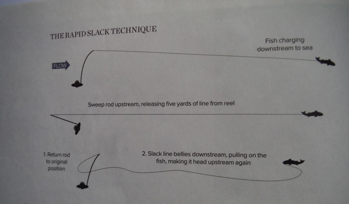 In the August edition of Trout and Salmon, Michel Evans describes something he calls the “rapid slack technique”. I call it throwing line down on a fish. Briefly, the idea is that if you find yourself in trouble with a salmon disappearing rapidly downstream towards somewhere you can’t reach, you slacken the drag at once to take off the strain and swing the rod rapidly straight upstream pulling more fly line off the rotating reel – about 5 yards in the case of a 15 foot double hander - before swinging the rod back towards the fish and (I would suggest) pulling even more line off the reel and dumping the whole lot downstream. When the line goes slack and the salmon no longer feels resistance from an upstream pull, it will almost certainly stop running and turn round to head into the current once more. When the current produces a sufficient belly of line below the fish tending to pull it downstream, it will begin to make its way slowly upstream towards the lie where it was originally hooked. When you have the fish opposite or above in a suitable position for playing and eventually netting, wind up the slack and get onto terms with it again. You may have to go through this procedure more than once, but it does work.