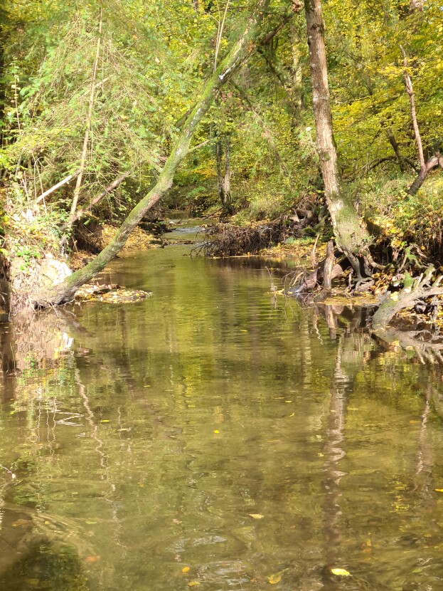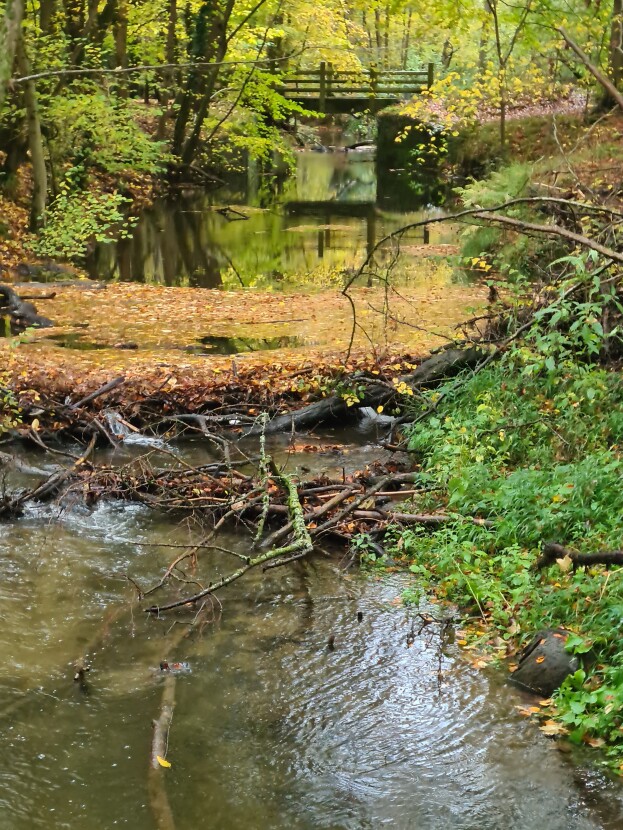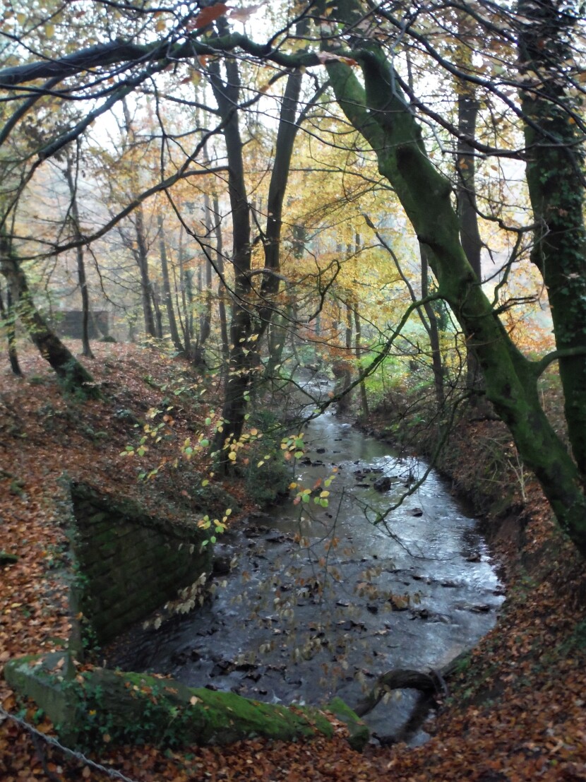 On 6th November I also trimmed the Cannop Brook between Whitecroft and Parkend. The situation was much the same, with all the main rivers in high flood, but the Forest streams running low and clear. The weather was unusual for this time of year, with air temperatures well over double figures night and day. This one involved a certain amount of co-ordination with the Forestry Commission and the Flood Risk Management people at the County Council, because measures are also being taken to increase the water retention of the brook and slow down flash floods. As I live near the flood plain you would in any case expect me to approve of that aim, but anglers need not be unduly concerned about the river. No canalisation is involved, but the removal of some gabion sections and leaving plenty of woody debris to encourage meandering of the channel…which is already happening, as you might guess. A lot of trees have fallen across lately, but mostly in a section of about 150 yards in the middle of the beat. That has produced a jumble of water and heavy timber which will stay and which I think makes a good fish refuge. The rest of it is challenging, but allows you casting room if you are careful. Blackpool Brook the following day was much easier as a high canopy has developed here many years ago.