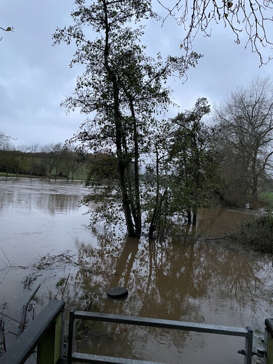 Back to the drama of rising rivers. By the night of 14th / 15th November Storm Claudia was living up to the amber warning given in advance. As often the case, it was the ditches and tributaries which rose first, then the larger rivers. The Forest of Dean is almost nowhere flat, consisting of a great dome with a hollowed summit seamed by valleys and “tumps.” 24 hours of heavy and continuous rain combined with drains blocked by fallen leaves quickly produced a series of “no-go” sumps of deep water making local roads impassable during that first night. Not for the first time, I wished we still had our old Landrover while I was trying to work out how to collect my wife from friends a few miles away across a flooded Forest. Further afield, extensive floods in Monmouth were declared a major incident by emergency services at 1.30 in the morning. It was difficult to work out at first whether to blame the Wye, already at the top of the bridge arches, and which must have back-filled the tributary, or was it the Monnow itself which came creeping up the high street flooding shops on the way. In fact it was the Monnow and a sort of tidal wave had come down the valley from Skenfrith. The water reached a depth of nearly 6 feet at the bottom of the town and cars were washed away. It was said to be the worse Monmouth flood for 40 years. Abergavenny on the Usk was also reportedly flooded by morning. Herefordshire was affected in a number of places by flooding from the Monnow, Lugg and Arrow systems. Apart from Skenfrith and Monmouth, even Ewyas Harold experienced a rise in the little Dulas brook, normally so harmless looking, which formed a 2 or 3 foot deep torrent romping down the main street. Locals must have been depressed to learn that The Dog and The Temple Bar Inn had both flooded. The Bridge Inn at Michaelchurch Escley under the Black Mountains, normally approached by a back road and a ford and pipe bridge arrangement, was understandably cut off. Trains between Hereford and Birmingham ceased to run, then the line to Shrewsbury. Before long fallen trees were down closing roads and railway lines all over the region. Up in Shropshire, communities like Leintwardine were defending themselves from a flooding Teme, while the flood-prone towns of the Severn valley used a brief warning delay to put up the barriers and flood gates ready for predicted high water the next day.