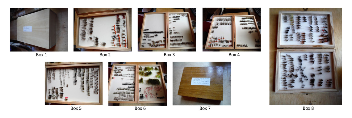 Fly boxes 1,2,3,4,5,6,7,8: These are all wooden boxes constructed in different sizes with brass hinges and catches, and come with two, four or six internal surfaces lined with foam sheet. These must have been around since the beginning of still water fly fishing. Only the smaller ones fit well in a pocket, but the larger ones are fine when placed on a seat in a boat. They are not waterproof and need to be kept out of the rain, but do at least float if inadvertently dropped in the water. In their defence, wooden boxes are relatively cheap, and represent a good value way of storing large numbers of lures, wet flies or nymphs. The hackles of dry flies will suffer if crushed against the foam however. The foam itself will eventually wear down through the constant insertion and removal of hook points and barbs, but replacement sheets for gluing in are available.