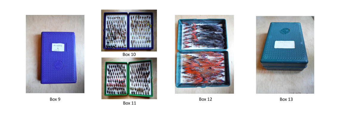 Fly boxes 9, 10, 11, 12, 13: These are the famous Fox boxes, formerly very popular. They were cheap, but not cheaply made, and very practical, being constructed of plastic with a sort of hard rubber interior lining with little raised ribs to grip the points of hooks by friction. There are two sizes of box with rounded edges, both of which fit in a standard waistcoat pocket. The deeper box for salmon and sea trout flies would certainly hold most of the usual sizes of double and treble salmon flies between 6 and 10, and the shallower box for trout and grayling flies is capable of holding 120 flies in sizes 10, 12 and 14…however note that the system does not provide a secure grip for larger than 10 and smaller than 14 trout flies. Nor are Fox boxes really suitable for dry flies with crushable hackles, although wet flies and nymphs live in them very happily. A range of colours – red, black, grey, two shades of blue and two shades of green - were available so that the angler could quickly recognise and grab from his collection whichever box he needed without looking at the label – although there is space for a label. They are not waterproof and do not float for long, but are otherwise pretty well indestructible. After a period off the market they are available again from something called The Great British Fly Box Company – I love that name!