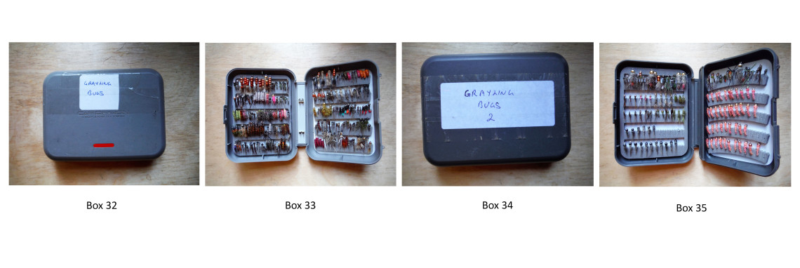 Fly boxes 32, 33, 34, 35: This is a small modern box from C&F Design. It is another with a smooth, rounded shape and the flies are held by friction in slits in a foam pad which, theoretically at least, should never wear. There is provision for colour coding on the outside of the grey plastic box and lugs for a lanyard. Not waterproof and suitable for nymphs or perhaps wet flies, but not dries. There is also a specialised tube fly version which goes sewin fishing with me. It has separate compartments for double and treble hooks.