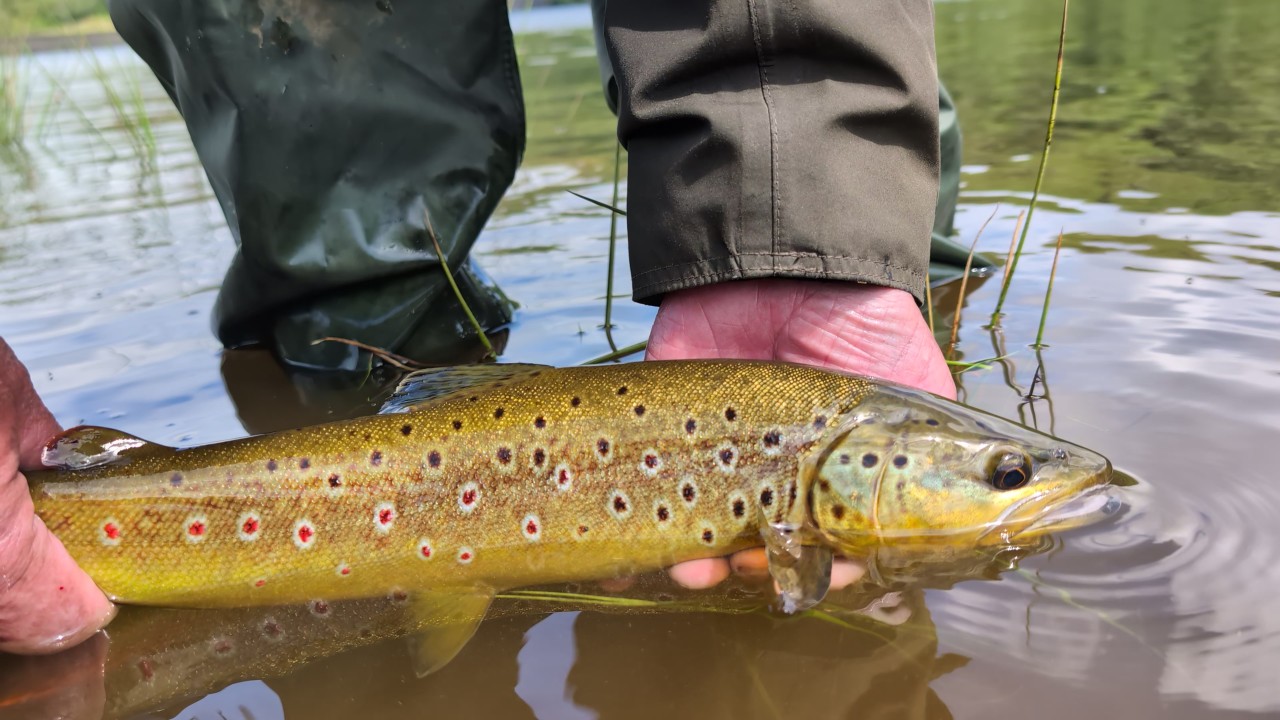 Llyn semi full, up to the grass verges so mostly mud and rock on the bottom. Easy access all around, unlike when it is full. Generally still with occassional gentle breeze and mainly overcast. Fished the morning up to noon. No takes on daddies/mayfly or pennell, but small Kate Mclaren pulled in a nice Brown trout on the last cast: 13”, 313gms