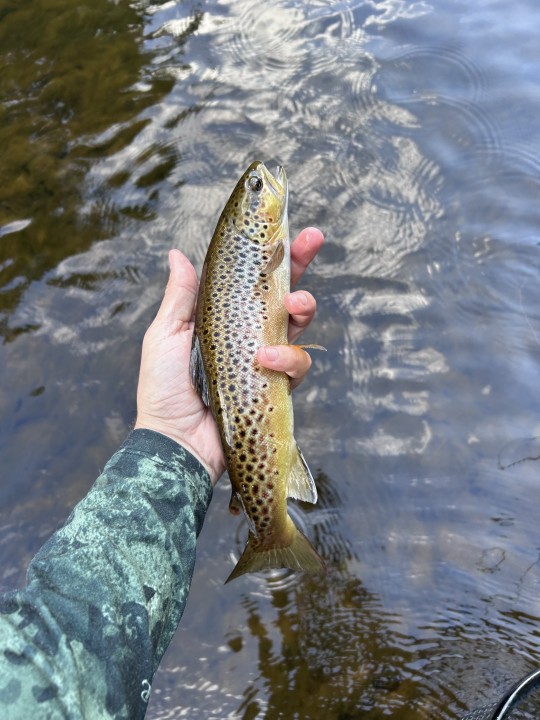 Fished 12-9pm. Sporadic rises early afternoon and fish extremely wary. Long stretches of the river very shallow and seemed mostly devoid of activity. Found some groups of fish in some deeper glides under trees and the river came alive from 6pm onwards. Hatches of blue winged olive and some brook dun. Fish seemed to be mostly taking small stuff / emergers, but tempted several on small cdc Emerger patterns.
