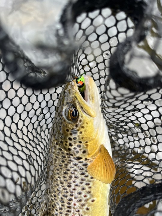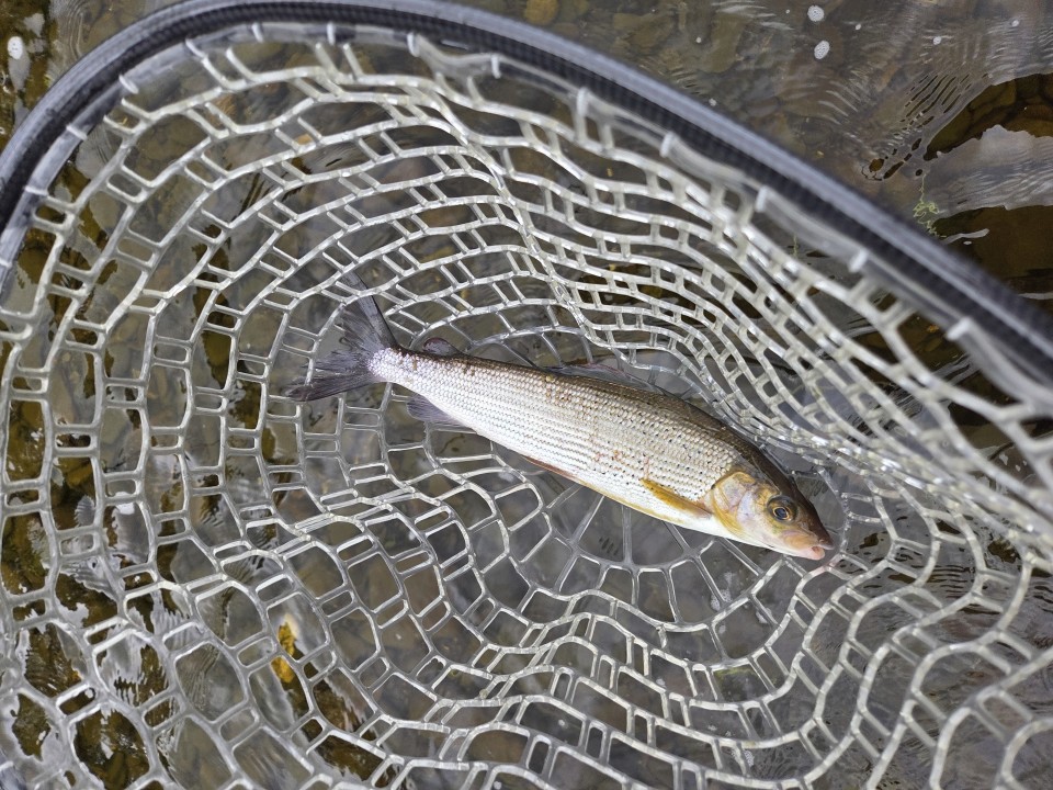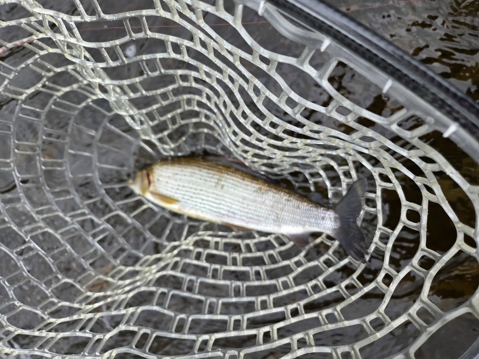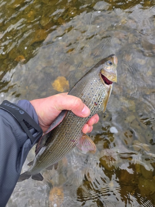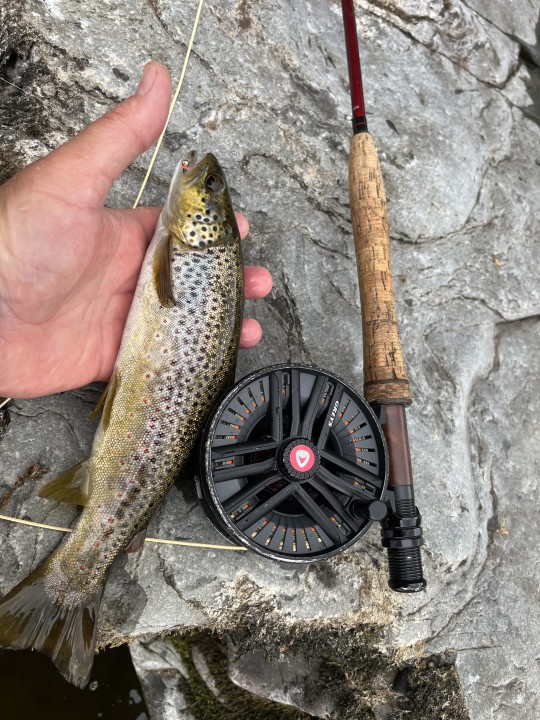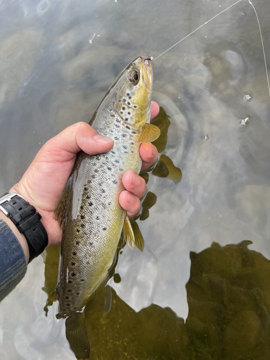 River up a little and some colour after yesterday's rain but very few flies about and no consistent rises. Only fished for 3 hours up to midday resulting in 4 lovely small trout from deeper pockets using weighted nymphs.