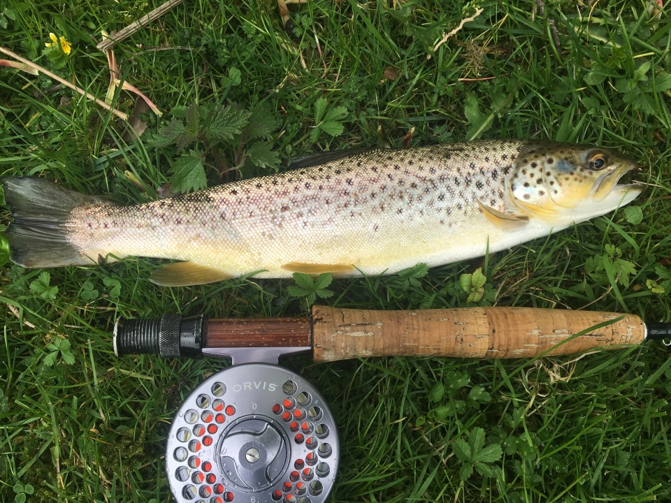 Overcast and muggy , water lever quite high which makes it difficult to get at the river on this beat . However found some promising areas an landed my first fish of the season, very handsome brownie on aPTN below a Klink.