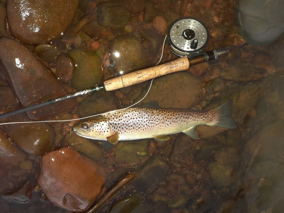 High(!) and somewhat coloured water, so a weak evening rise. Just a few, smaller fish taking a dun
