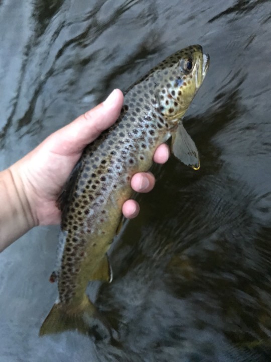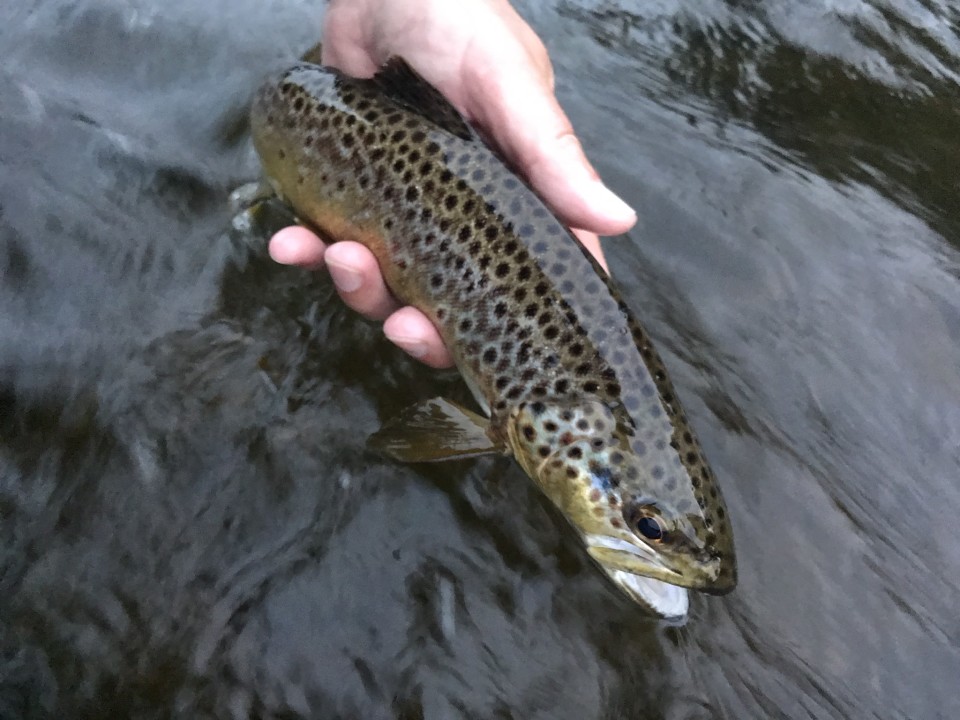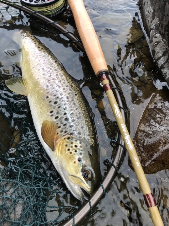 Challenging afternoon weather wise, never the less, eight Trout caught and several missed. River was fairly low, badly in need of a good wash through which is what is forecast this weekend.