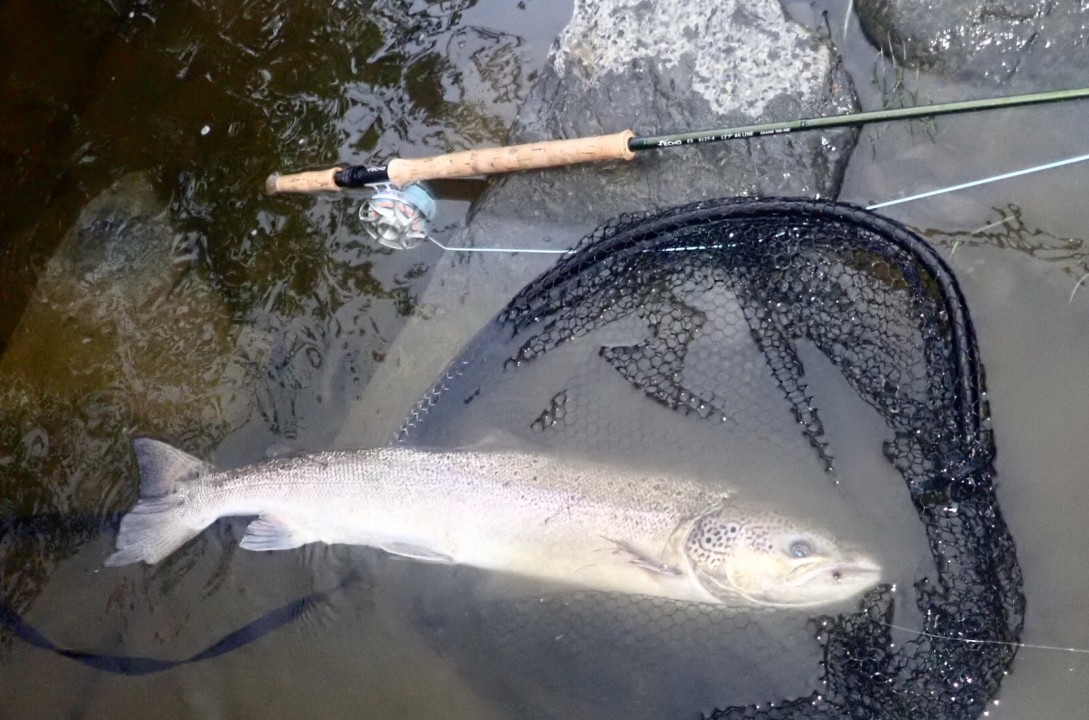 Water was at a good height, dropping and clearing. Caught one salmon of about 8lb on a size 12 gold willie gunn fished on a full floating line with a sink tip. The fish wasn’t fresh but recovered well and swam away strong. Caught in the mill stream during bright sunshine at lunch time. Well worth the visit from Anglesey.