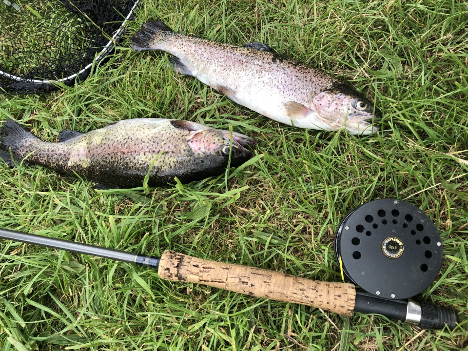2 trout caught on the fly using a nymph, one 18 inch one 20.5inch