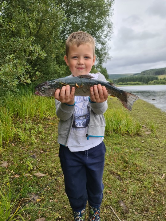 Lovely fish caught by my 6yr old son on worm. Just as we calling it a day he reeled the only catch of the day out of 5 of us fishing. Good fight not sure but think it was about 1-2 lbs Blue trout.