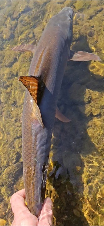 Bright hot day and river very low and clear. All fish taken on groundbait feeder tactics with double 10mm Mainline ISO Fish boilies on the hook.