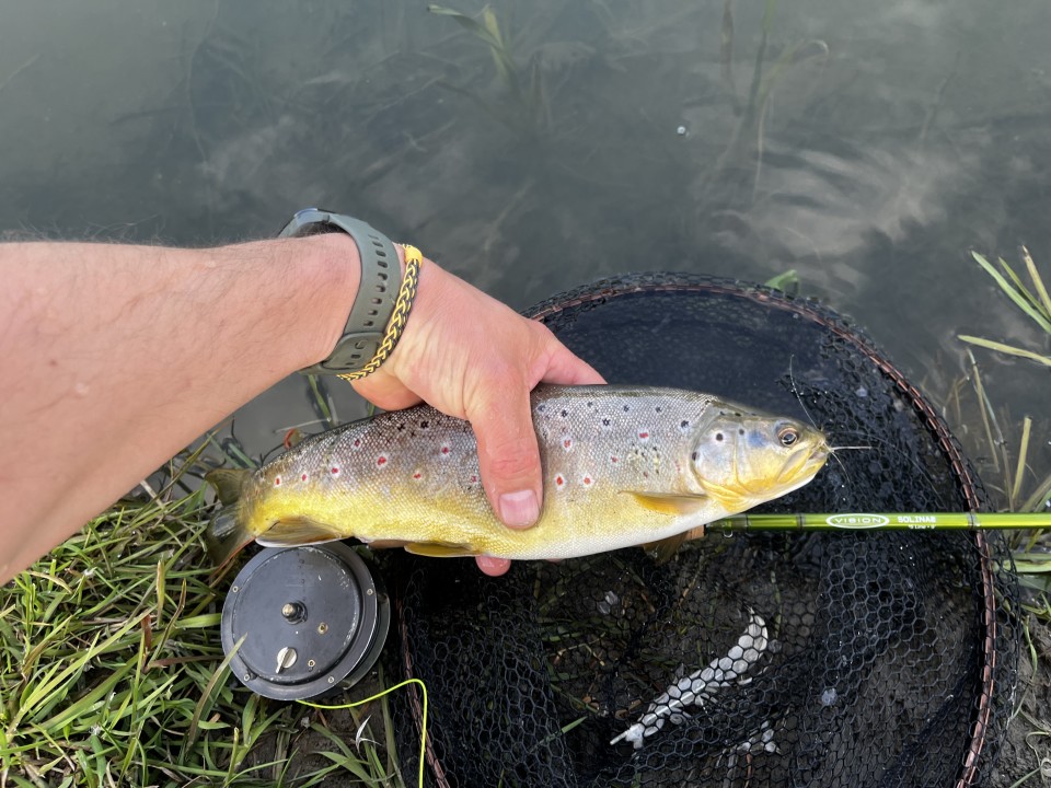 Booked on a last minute whim, hatches have started, water slightly coloured from recent rain, fish holding up in deeper water, rises mainly where I couldn’t get into position, but did get a brownie on a Mayfly Parachute, should have been more but got hung up playing with the one fish instead of moving on. Beautiful evening.