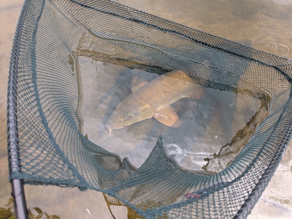 I rested the fish for a good 10 minutes before quickly weighing, resting again, and returning my best barbel ever (I've only caught 4) at 7lb11oz. Fish had some old scars and it seemed to be blind in one eye but was still beautiful and fighting fit. Delighted!