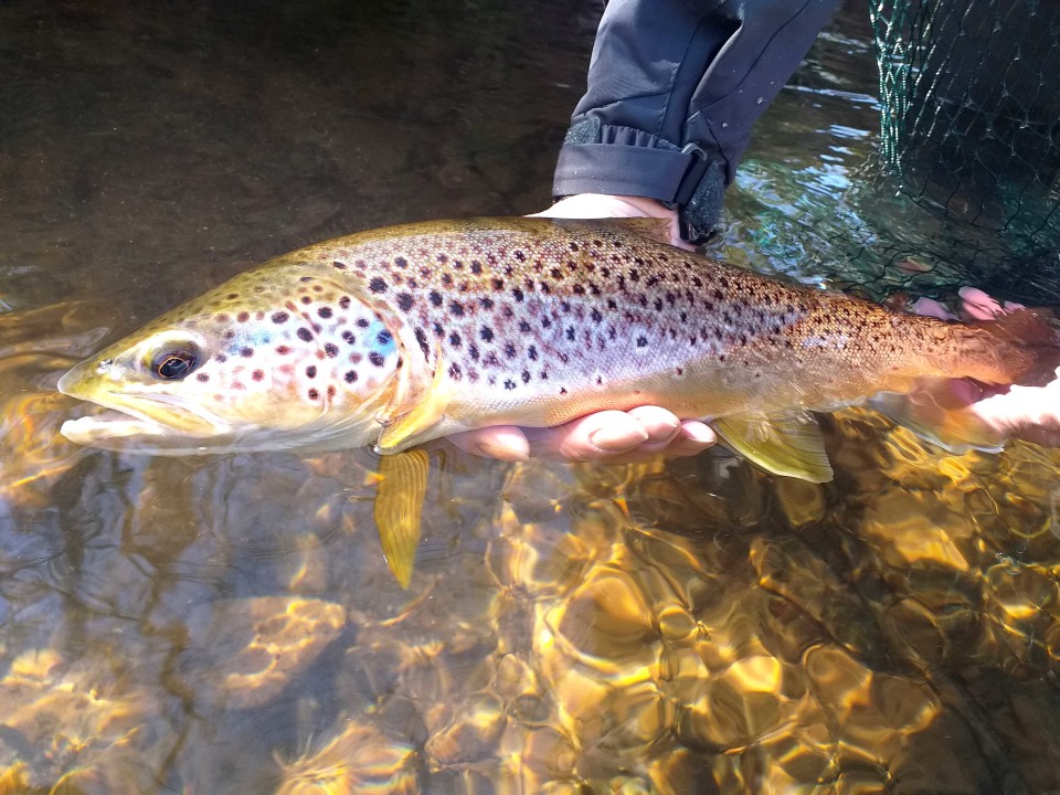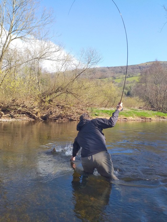 Once the hatch had finished I gave my wife some casting lessons, with her fishing a nymph down and across through the riffles. She landed her first Usk brown trout, a 1 1/2 pounder before hooking a huge fish that thrashed around on the surface for a few seconds before coming off. It looked to me like a fish well over 5lbs and one that would have absolutely demolished my PB wild brown trout over a 45 year fishing career, about an hour into hers!