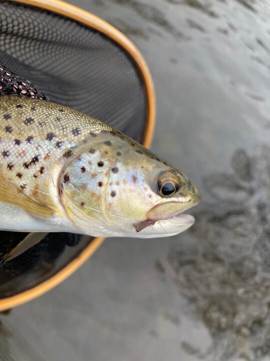 Cold, misty start with a bit of wind about, so not loads happening early on. Started off fishing nymphs through the deeper runs and picked up 1 brown on an olive nymph. As the day went on there was a bit of a hatch coming off, so switched over to a grey dry (not 100% on the pattern but it was close to what was coming off) and that did the trick.