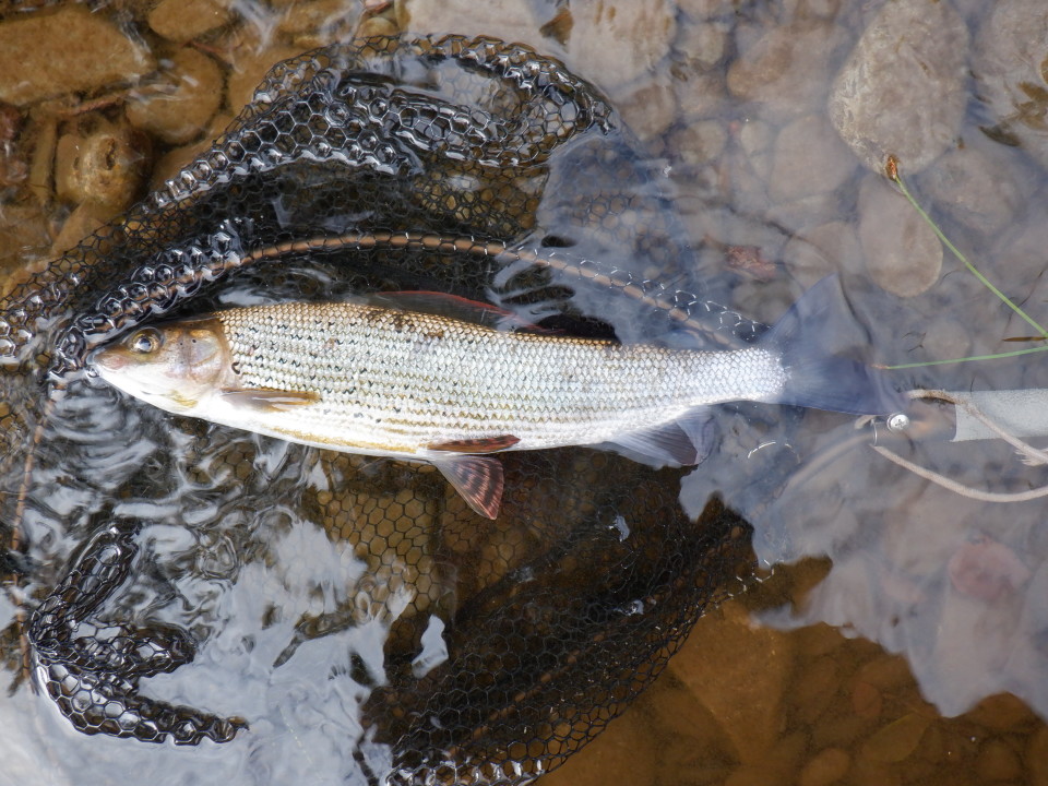 Some midge and sedge and little wind in the morning but no rising fish. A few risies in lulls in the wind in the afternoon. Fished bugs and found trout and grayling in faster, shallower water towards the heads of pools. Trout and grayling to 15", ~1.75lb, on bugs and later on HE emerger. Lost a big trout when the point bug hooked up on a rock and the dropper broke - totally gutted but I know where it lives!
