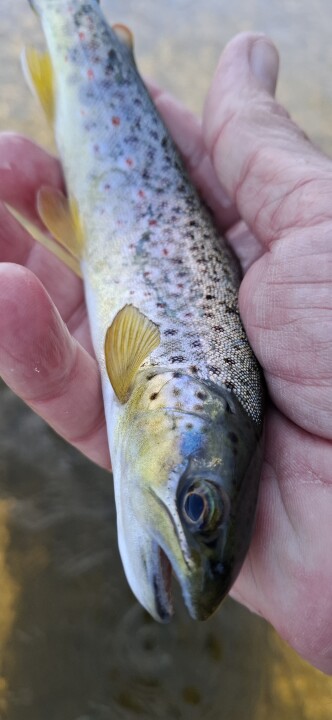 Bright sunny day. V. Clear water. Lightish hatch of spring olive around midday - lost a fish to an imperial. Got one on nymph late on ( about 6pm). V few rising fish. <5 all day - mostly oncers.