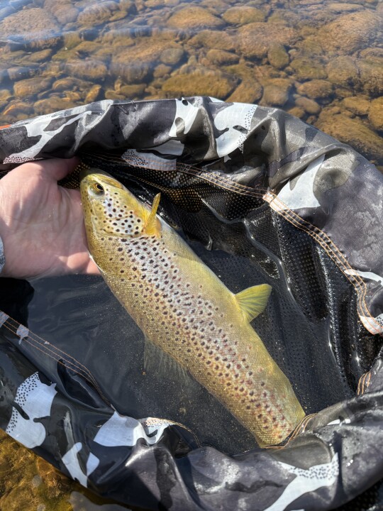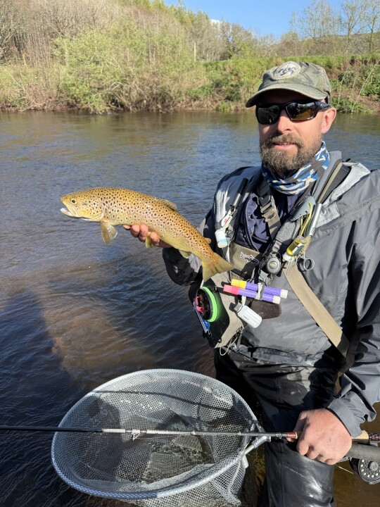 River nice height but wind all day made it hard. Some heavy hatches of March browns between 12.15-1.30pm and the trout did come up for them in short bursts. Numerous takes on dry flies but only landed one. Others on hares ear nymph, and again several missed and lost.