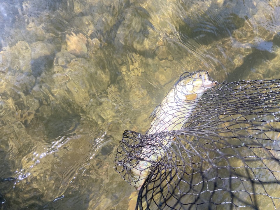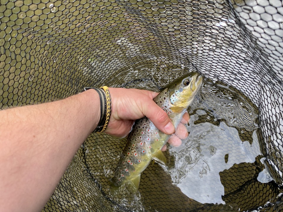 Overcast day, cold wind, still low water, still waiting for the hatches…a couple of rises, only one Beautiful Brown Trout, which put up a good fight.