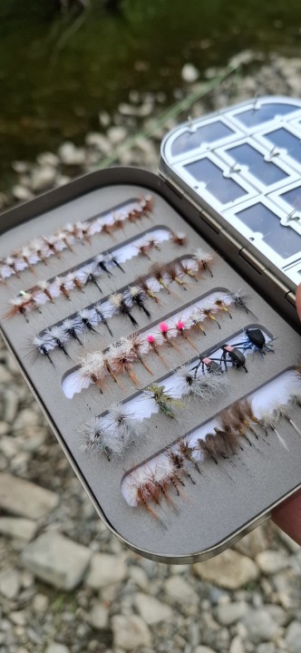 Dries as usual, two good sized fish for here, in a tally of thirteen . Ghr usual chubby hooligans for here .... all about seven or eight inches, lovely takes to ghe dry ...Half to risers, half at the fast stuff, in the heads of pools .......