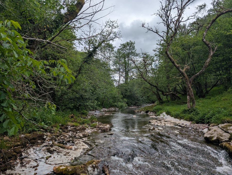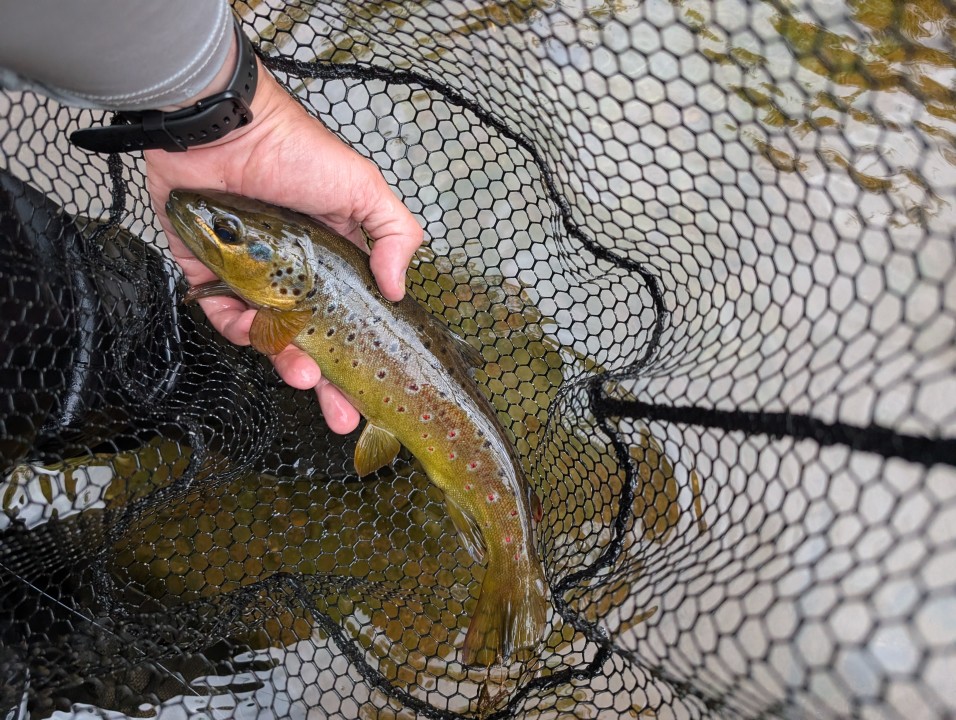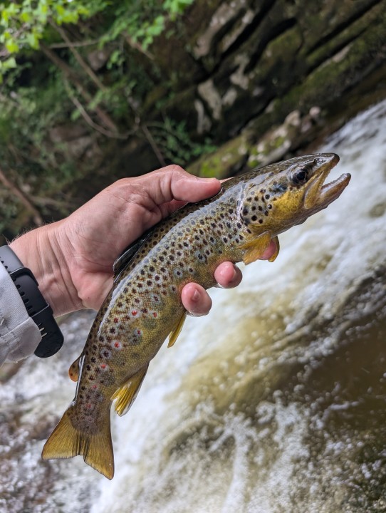 Overcast and drizzle. Banks slippy but manageable. Water slightly coloured. Fun on the dry with two netted and one on a nymph.