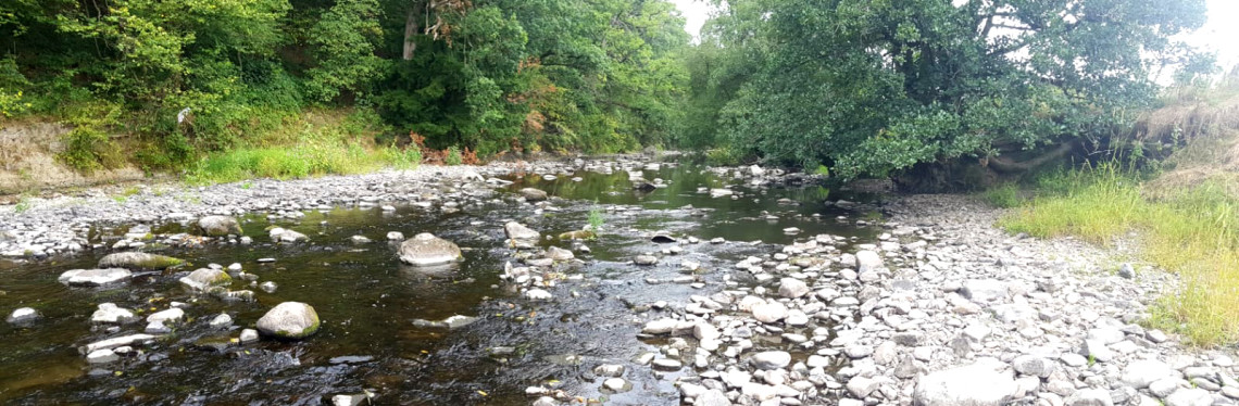 The lower Ithon in August However, continuing high water temperatures in the Wye below Builth were distinctly worrying. Nor was there any real sign of relief coming. Cloudy days were mixed with the sunny ones, often there was low mist over the hills and sometimes localised showers of rather fine rain. Nevertheless, there was hardly any water flowing down the channels yet, no really serious rain in prospect and, if anything, air temperatures were predicted to rise again over the long term. The short and localised showers were tantalising rather than useful. There were plainly large numbers of salmon and sea trout held up in the estuaries without the water to run further, but it was unclear when the drought would end and we could consider ourselves clear of trouble. Quite unexpectedly on the final day of July heavier showers in Central Wales produced a short-lived rise of about a foot in the upper Wye, the Irfon, and also the Loughor. By 1st August that had translated into a level of 1ft at Llanstephan, a rise of about 9 inches in total, although the water looked quite dirty. (Be in no doubt that when the real flood comes, a huge amount of muck will be washing downstream until the rivers clear). This little rise must have done the Wye some good although the Usk and Monnow were unaffected.