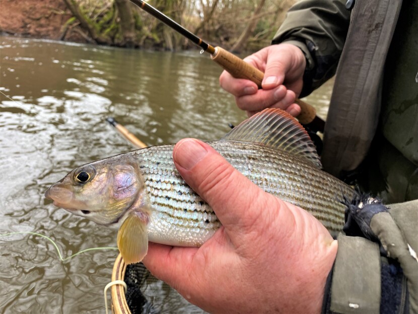 There is no reason why pleasure anglers should be so inhibited. Nick had to obtain a rod called of all things a Dragontail Hellbender from the USA which can apparently be used at 11 feet or extended to 13 feet. For years I have owned a 12 foot long Seiryu with the action rated at 6:4 and had a lot of fun with it fishing for winter grayling on rivers large and small (it is not too long, for example, for the Monnow or the lower Llynfi). It gives you the needed reach and is perfectly capable of playing large grayling, not off the tip, but by bringing the butt section into action using two hands. I have a choice of leaders for it: furled tapered ones of several lengths and a coloured level line with sighter markings to which I attach a fluorocarbon tippet section via a mini ring. Whether you use an indicator or not and which kind is up to you as we aren’t match fishing, and the same goes for the flies. Nick gives a list of winter Tenkara patterns, but I would suggest any favourite bugs in which you have confidence should fish well by this method.