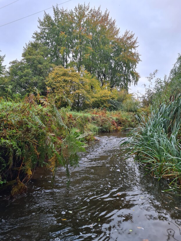 On 6th November I also trimmed the Cannop Brook between Whitecroft and Parkend. The situation was much the same, with all the main rivers in high flood, but the Forest streams running low and clear. The weather was unusual for this time of year, with air temperatures well over double figures night and day. This one involved a certain amount of co-ordination with the Forestry Commission and the Flood Risk Management people at the County Council, because measures are also being taken to increase the water retention of the brook and slow down flash floods. As I live near the flood plain you would in any case expect me to approve of that aim, but anglers need not be unduly concerned about the river. No canalisation is involved, but the removal of some gabion sections and leaving plenty of woody debris to encourage meandering of the channel…which is already happening, as you might guess. A lot of trees have fallen across lately, but mostly in a section of about 150 yards in the middle of the beat. That has produced a jumble of water and heavy timber which will stay and which I think makes a good fish refuge. The rest of it is challenging, but allows you casting room if you are careful. Blackpool Brook the following day was much easier as a high canopy has developed here many years ago.