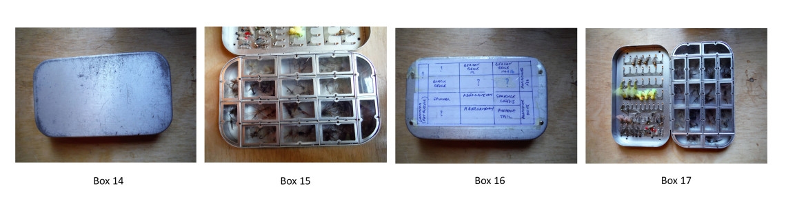 Fly boxes 14, 15, 16, 17: The classic Wheatley fly boxes go back to the 1860s and are still available today, although at much higher prices in real terms than we paid fifty years ago. They consist of aluminium boxes with very close engineering fits, little dry fly compartments with spring-loaded transparent lids, and inside the opposing lid a system of clips to grip the bends of wet fly or nymph hooks. Some of the modern ones have a sheet of foam rubber as an alternative mounting for the wet flies. They protect dry flies very well, provided you do not overfill the compartments. Polished aluminium tends to rub and scuff which means that the patina of the outer box is always very interesting; the older they get, the better they look. They are not water-tight.