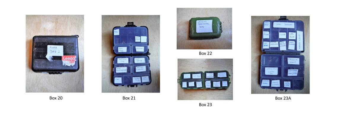 Fly boxes 20, 21, 22, 23, 23A: These little plastic boxes with compartments are available from most coarse fishing tackle shops and I think are intended, not for flies, but for odd items like split shot, weights, swivels, rubber sleeves etc. However, they are rounded to fit in the pocket, extremely cheap and do well enough for small dry flies, even if not water tight. These came from Yorkshire Game Angling.