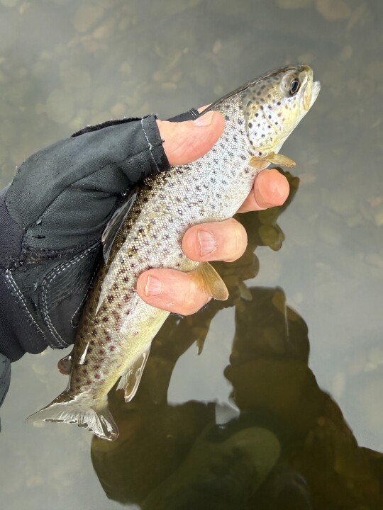 Fished about 11 to 3pm. 2 on nymphs, then a sparse hatch of LDOs between 1 and 2pm. Saw two fish rise, and caught one of them on an olive jingler.