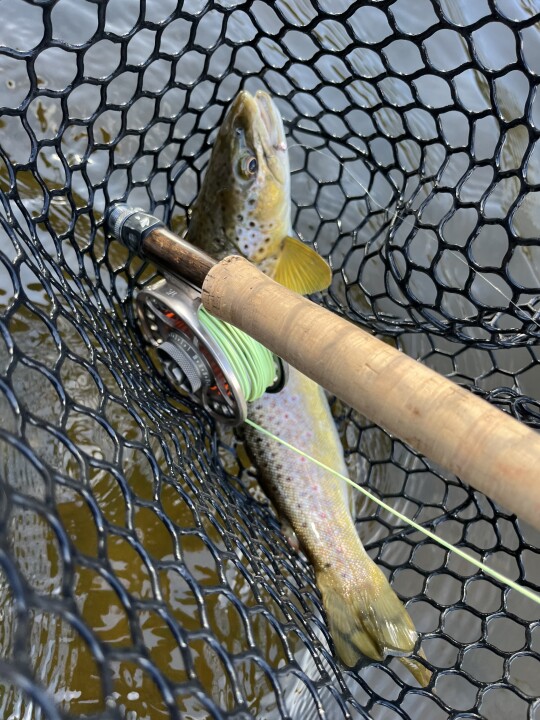 The river looks unexpectedly good today. Of course, a little high and fast. All brown trout were caught into Ash Tree Pool: 2 in net and 3 lost.