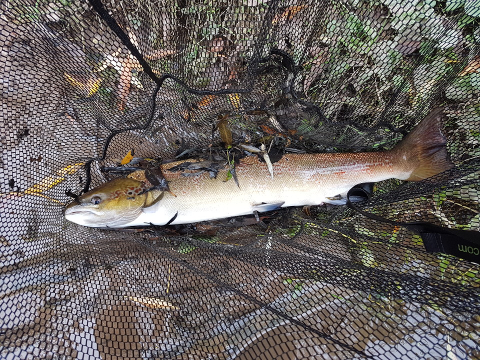 18lb salmon from The Stones on a SHFC. A few others seen in the Dog Hole and Stones. Water remained coloured throughout the day with the water height consistent at 0.72m on the Ross gauge. Fly fishing a challenge as a result.