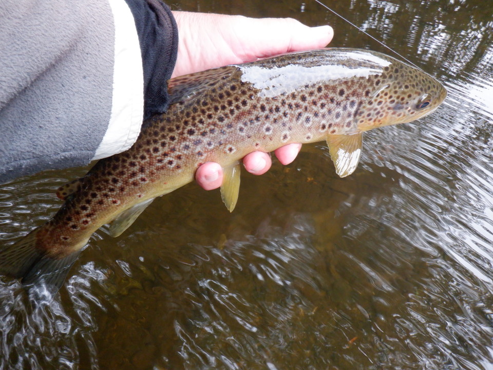 Mild and over cast with river pretty low and clear. No sign of rises so nymphed for a while but with no success. Around 4ish a few rises spotted so switched to dry fly and one hard fighting 12” Brown Trout taken on a small black F fly. Photographed and quickly released.