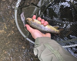 6 x trout 6-10 inches, Monnow Gosling. Now the Forest is full of people, even early in the morning. The new bank-side path was busier than ever today, with family groups, each with at least one swimming dog, proceeding up and down. Twice somebody came up to where I was starting on a pool, looked at me, threw a stick in the water for the dog to fetch, and then asked : "Any luck?" It's very difficult not to sound bitter when engaging with one of these bozos. How can they be so unfeeling? Alas for human nature, particularly other people's! And then along comes a family with two dogs on leads, who watch me catch and release a fish, say "Hi" and ask some intelligent questions about the stream and the creatures which live in it. Why can't everybody be so pleasant and sensible so we can all enjoy ourselves? By the way, we have a highly successful crop of young dippers on the stream this spring.