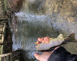 Seven trout, all but one caught on the nymph suspended under a Klinkhammer. I probably lost another 10. Also quite a few trout went for the Klinkhammer but were not hooked. At one point I spooked three fish that darted for cover in the roots. I stood there for several minutes after which they started to break cover and swim within 6 feet of me. Tried sight fishing with the nymph passing right in front of them and they all swam to the nymph but never took it.