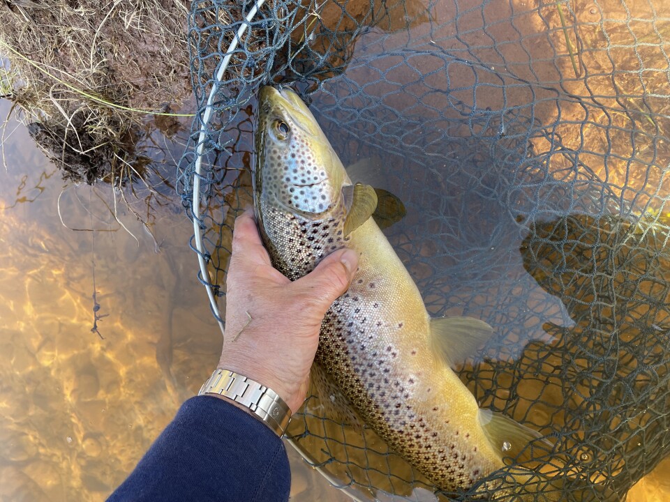 Decent hatch of dark olives for 90 minutes at 12.15 … 3 8/12 oz fish and one beautiful fish of nearly 3 pounds …. Delightful day despite slightly high water …