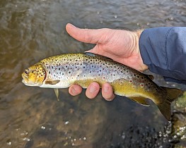 A cool day for the time of year and the river a little murky after heavy rain 48 hours previous. Some mayfly present and fish rising, though not in abundance, from 1100. Seeing the mayfly I tied on a similar dry fly with a nymph dropper, a few trout rose to the dry but none took it, eventually caught a brown trout which took the nymph. It was returned. I fished until about 1700 and would have stayed had I been able to as the fishing was still on.