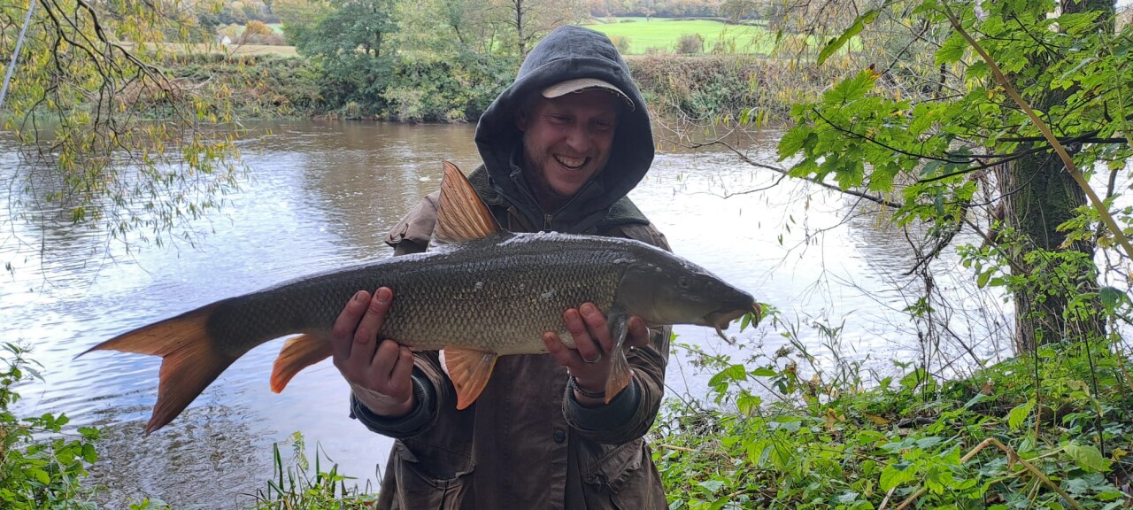 River slightly high and lots of leaves coming down so we knew they'd be in the slacks, where I found 2 barbel of 5 ish and 7 ish pounds but O B could only find one chub. All fish came from the deeper, relatively calmer wooded section, on the lead with pellets and PVA mesh for feed.